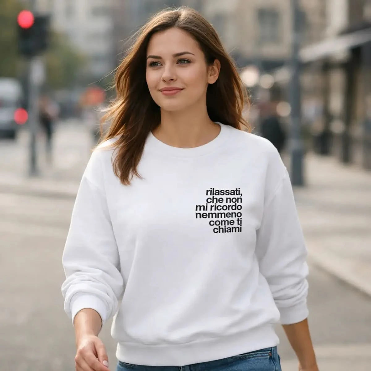 La frase “Rilassati, che non mi ricordo nemmeno come ti chiami” può essere posizionata sul fronte o sul retro della felpa, in base al tuo stile. Una soluzione perfetta per chi preferisce un look più discreto o, al contrario, più diretto.