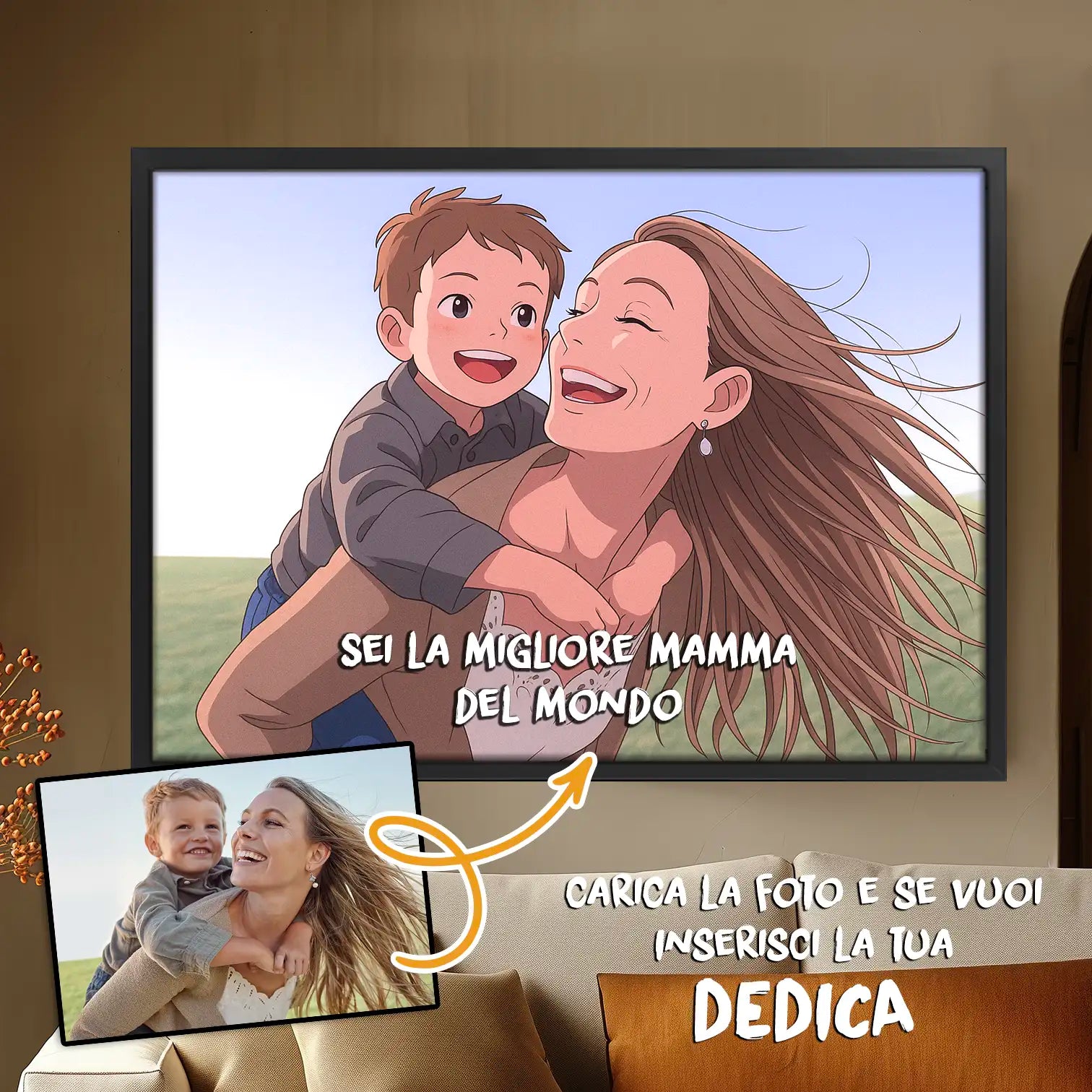 Questo quadro effetto Ghibli per mamma trasforma una foto speciale in un ricordo illustrato dal fascino dolce e sognante. È pensato per la Festa della Mamma, ma si presta perfettamente anche al compleanno, a Natale o a qualsiasi altra occasione in cui vuoi regalarle qualcosa di personale e diverso dal solito. Tu devi solo caricare la foto e, se vuoi, aggiungere una dedica: il nostro reparto grafico realizzerà l’anteprima personalizzata e te la invieremo prima di procedere con la realizzazione finale.