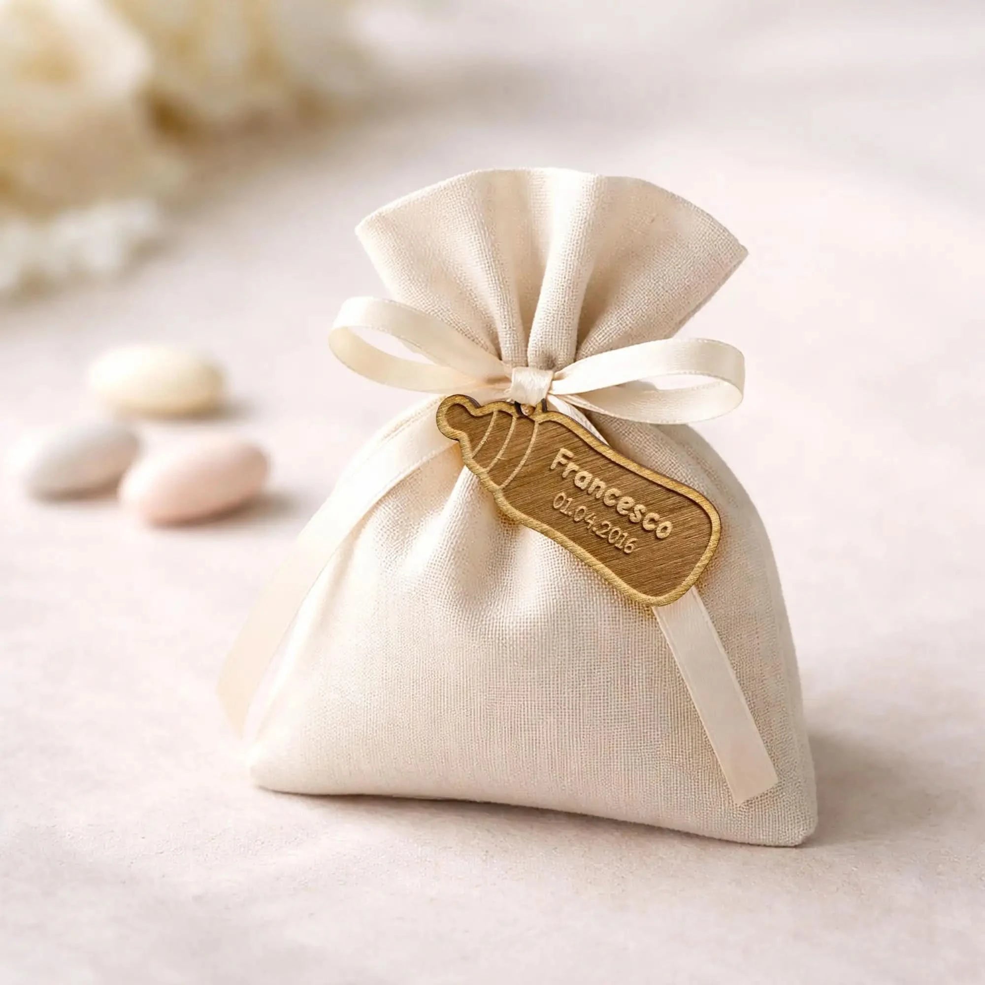 No, il sacchettino visibile nelle immagini è solo a scopo illustrativo e non è incluso. Riceverai esclusivamente i tag in legno personalizzati.